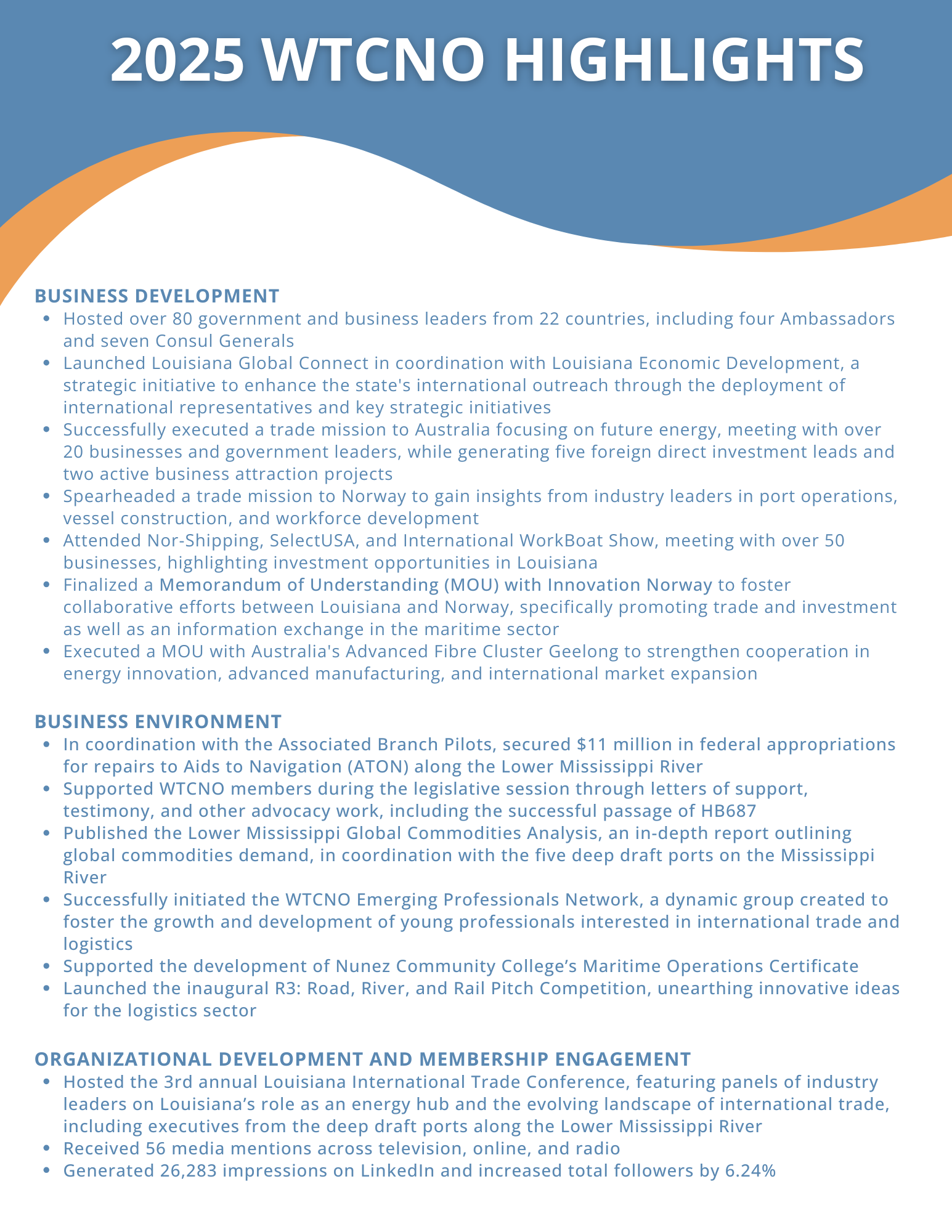The vision of the World Trade Center New Orleans is to be the premier voice of international trade and business in the Gulf South. The ultimate indication of success will be the presence of a vigorous and growing international business community, supporting Louisiana’s status as the “gateway to North America.”